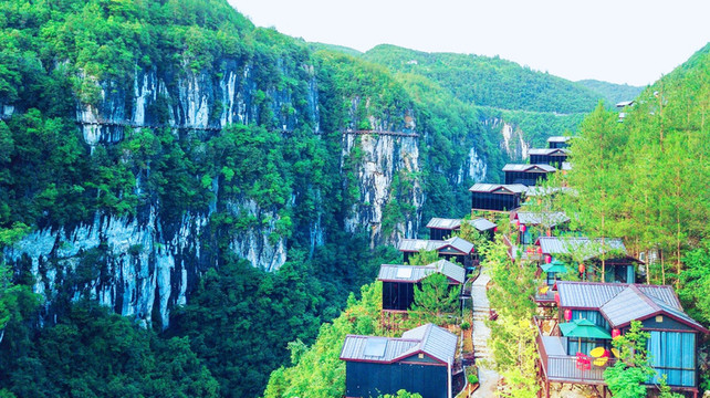 当今峡谷网红景观悬崖玻璃民宿群