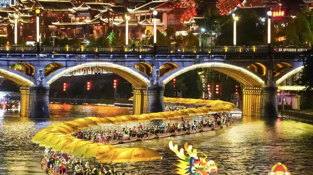 【实力商家·品牌赠送】在宣恩河滨广场上龙游贡水·乘竹筏夜游体验(价值88元/人),百余支竹筏排成长龙穿行在贡水河上、身穿民族服饰和汉服的幺哥幺妹儿乘舟对歌、谈笑风生、