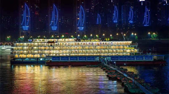 游轮停靠三峡大坝上游——秭归茅坪港,此处位于“高峡平湖”江段,晚上约21:00游轮将从这起航,逆江而上,从湖北宜昌出发,前往重庆。